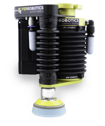The FerRobotics AOK 401 is a finely tuned system package based on the Active Compliant Technology (ACT) and a specially designed electric random orbital sander optimized for robot use. A fully integrated servo motor provides the drive. This integrated complete solution automates the industrial sanding process with individual control of all process parameters: rotation speed, contact force and feed rate. The system design is compact and robust. The enormously durable sander is designed for industrial use and delivers twice the output of standard devices, 24 hours a day, 7 days a week. It requires little maintenance and is universally compatible with many abrasives.