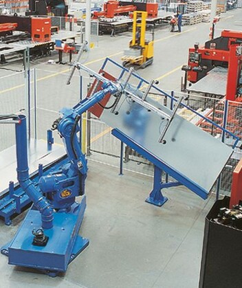The MOTOMAN MH180 robot (current type: MOTOMAN GP180) picks up the sheets from an inpallet table and the finished products are placed on a pallet or roller conveyor. The roller conveyor can have a pallet magazine for empty pallets.