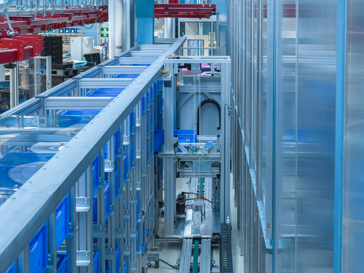 Picture: The filled SLCs travel via an FMS conveyor line from MiniTec to the storage rack. Empty boxes are then returned to the robots.