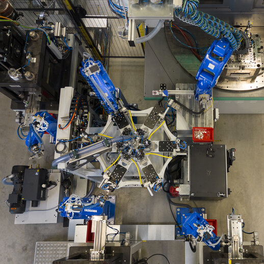 The system concept developed by MSA essentially consists of three parts: pre-assembly and injection moulding machine, followed by finishing and quality assurance. The entire process is fully automated and runs exclusively in unmanned operation. Robots are used for all steps (except for the actual injection moulding in the machine) – more precisely: nine industrial robots from Yaskawa’s Motoman GP series.